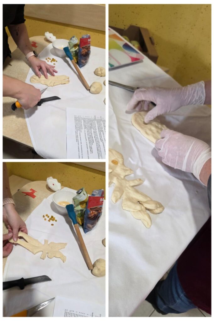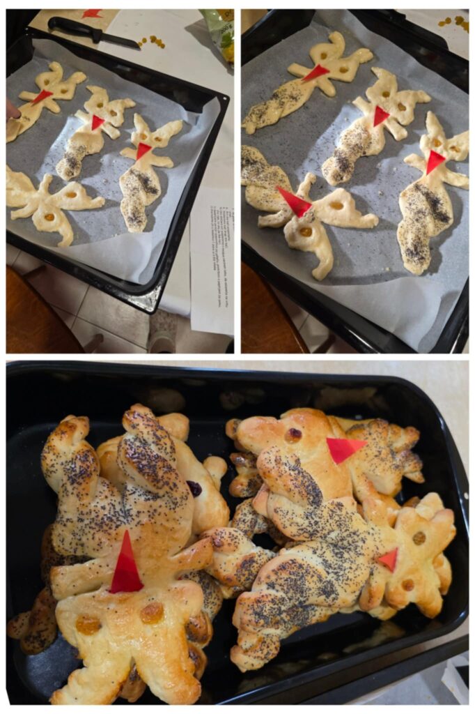 Ob peki ni manjkalo smeha, radovednih otroških pogledov in ponosa ob končnih izdelkih. Otroci so z veseljem pomagali pri oblikovanju testa, dodajanju rozin in okraševanju, prostor pa je kmalu napolnil prijeten vonj sveže pečenih dobrot.